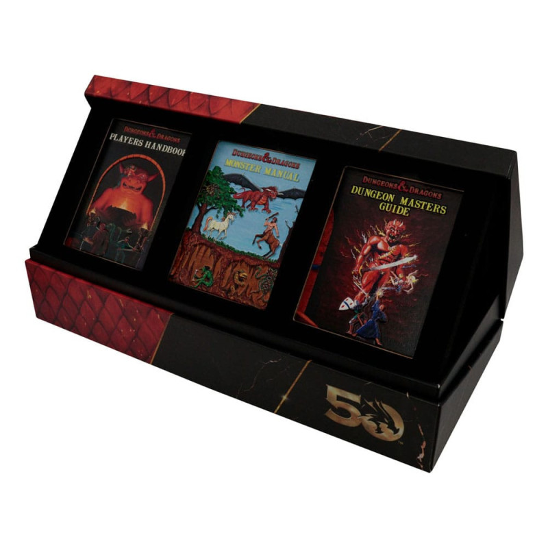 Célébrant les 50 ans de Dungeons & Dragons, ces trois lingots en édition limitée représentent les œuvres de Dave Sutherland et Dave Trampier pour les premières éditions du Players Handbook, du Monster Manual et du Dungeon Masters Guide, qui restent aujourd'hui la norme de l'industrie en matière de règles de jeu. Chacun mesure 70 x 90 mm, est fini en or antique et est décoré d'émail coloré.