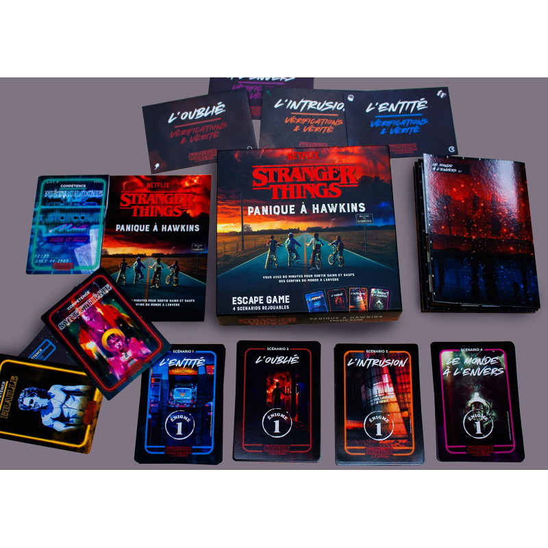 Voici un superbe coffret avec un kit complet pour organiser une incroyable soirée escape game entre amis, dans l'univers oppressant de la célèbre série à succès de NETFLIX "Stranger things". Retrouvez-vous en 1983, dans la petite ville d'Hawkins, avec Will, Mike, Onze et affrontez des phénomènes surnaturels. Explorez l'univers fantastique de "Stranger Things", grâce à 4 scénarios, plus captivants les uns que les autres.